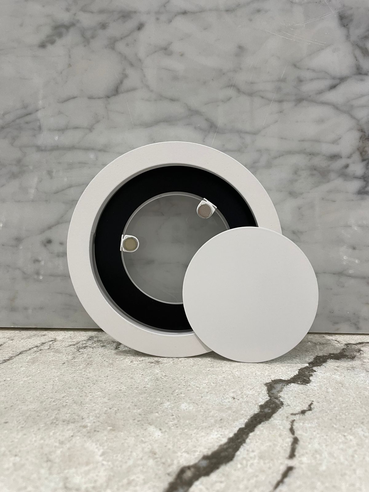 Рамка прикрепляется к стене или полотку при помощи саморезов или клея, а верхняя часть с глухой панелью фиксируется к рамке при помощи неодимовых магнитов.