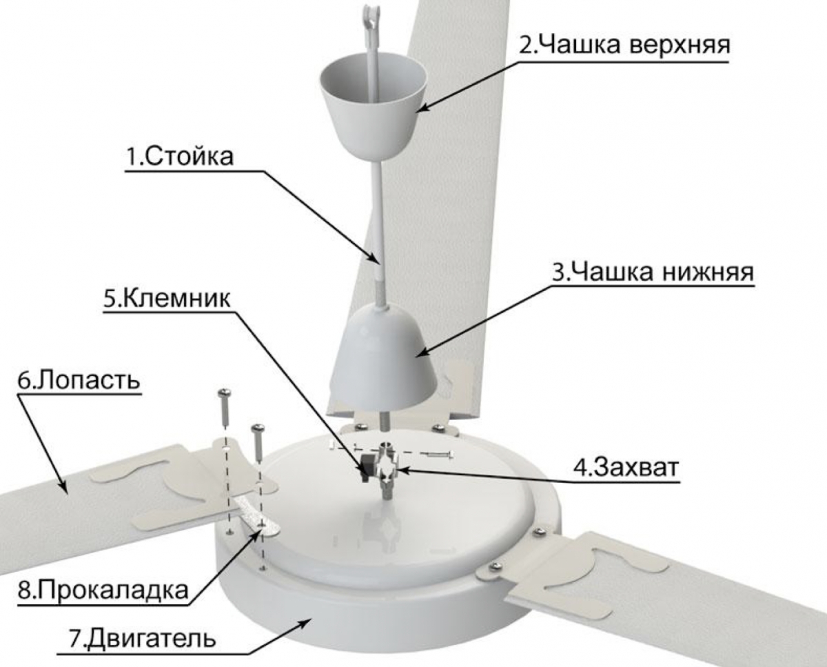 Потолочные вентиляторы МР-1 представляют собой устройство, состоящие из двигателя, лопастей, приспособления для крепления на потолке, верхней и нижней декоративных чашек – закрывающих технологические конструкции, регулятора скорости и стойки.